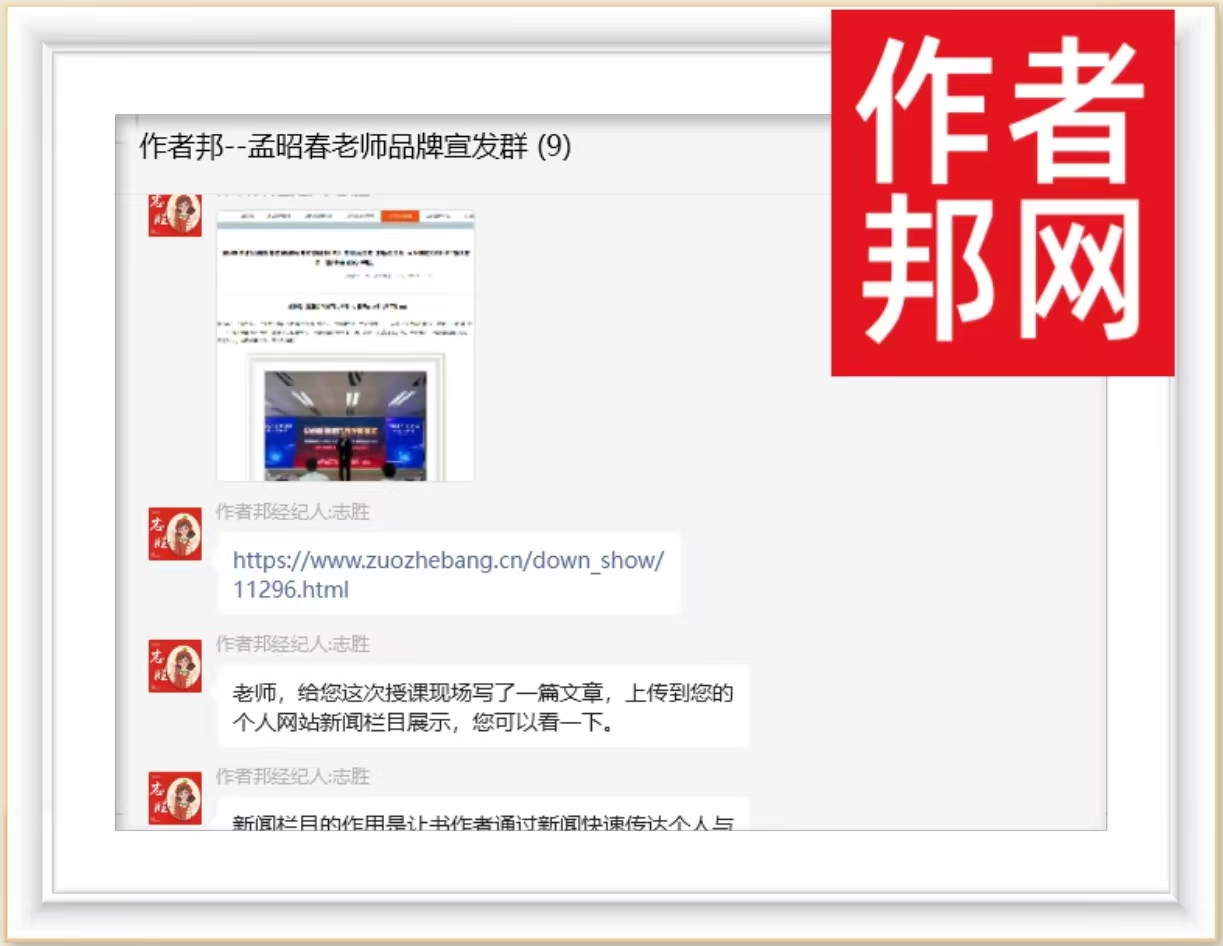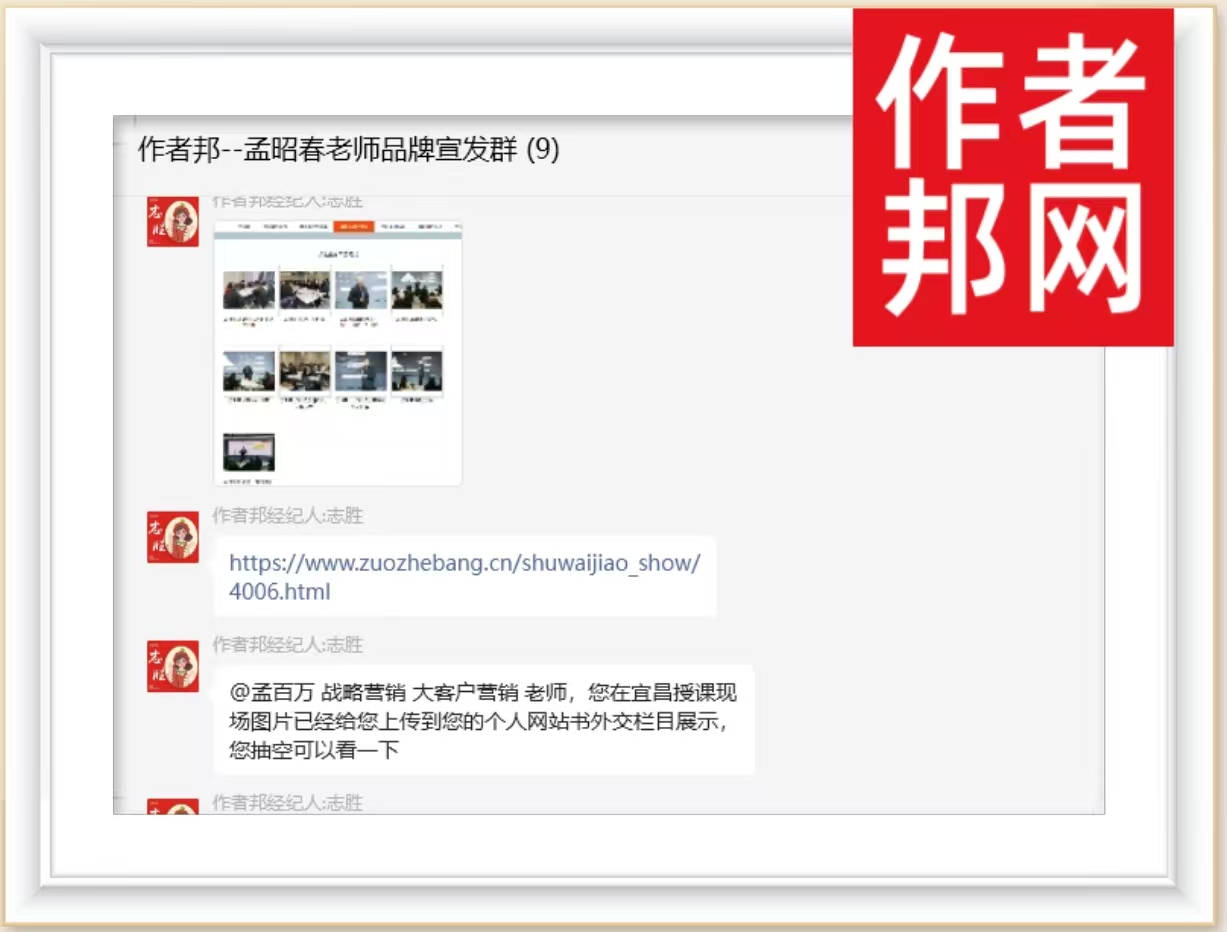 (作者微信群服务截图)作者邦经纪人帮助孟昭春老师,收录他到宜昌授课《打赢缩量时代的存量博弈——战略营销与策略组合创新实践》的最新课程培训照片,上传到孟昭春老师个人营销网站书外交栏目...