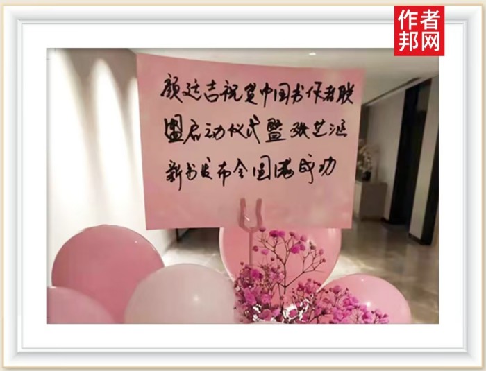 在本次活动中,颜廷吉老师也为大家送去了自己最真挚的祝愿。他的祝愿方式,是一个满载着心愿和节庆气氛的花篮。花篮上,装满了许多粉紫色的鲜花以及粉色的气球。它们,给花篮装点得充满了喜气。而最为让人瞩目的,则是这个花篮顶部的祝福贺词。颜老师说到:“祝中国书作者联盟启动仪式暨张芝涵新书发布会圆满成功。”如此,很好地表达了他的内心祝福。