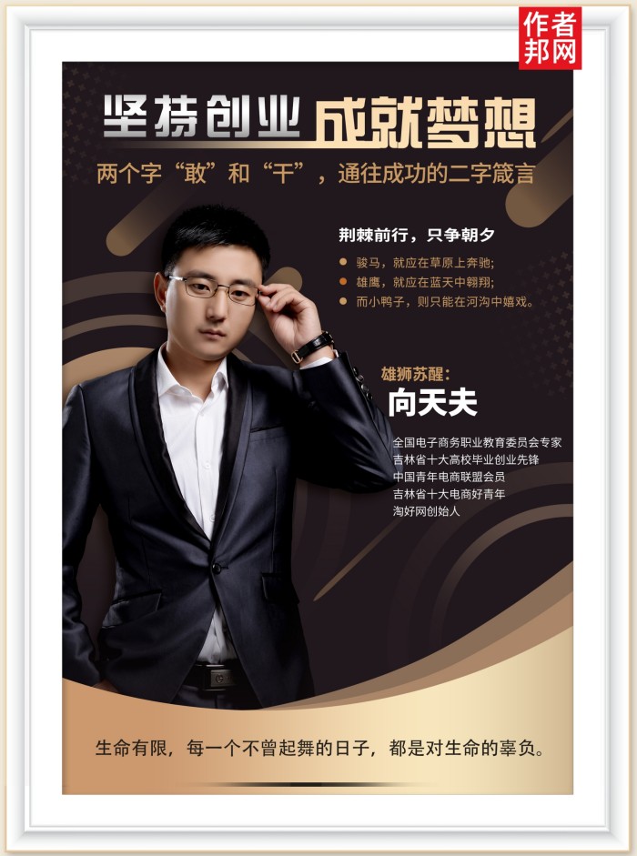而今,他已经是淘好网,商周谷语的品牌创始人。他被评为吉林省十大电商好青年,被冠之吉林省高校毕业创业十大先锋,由他写成的《粉丝运营:吸粉技巧+盈利模式+实战案例》已经成为炙手可热的畅销书,向天夫,成了热血创业者的标杆。