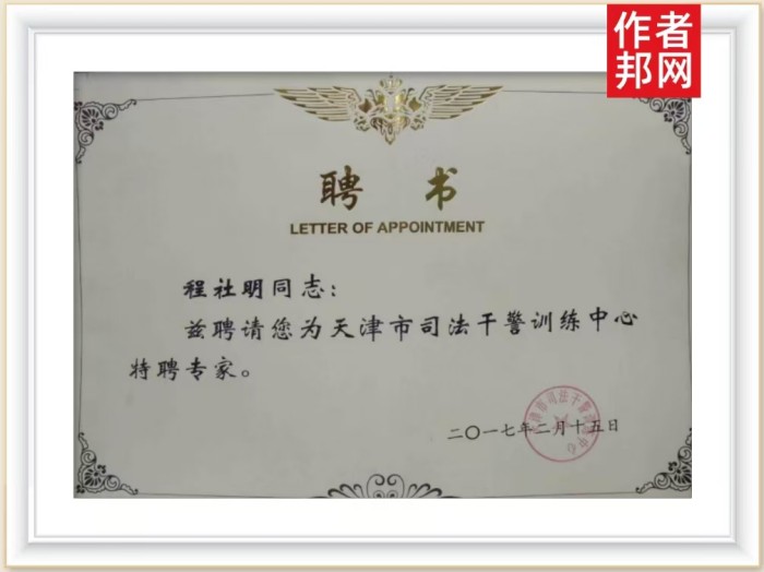 (程社明老师被聘请为天津市司法干警训练中心特聘专家)