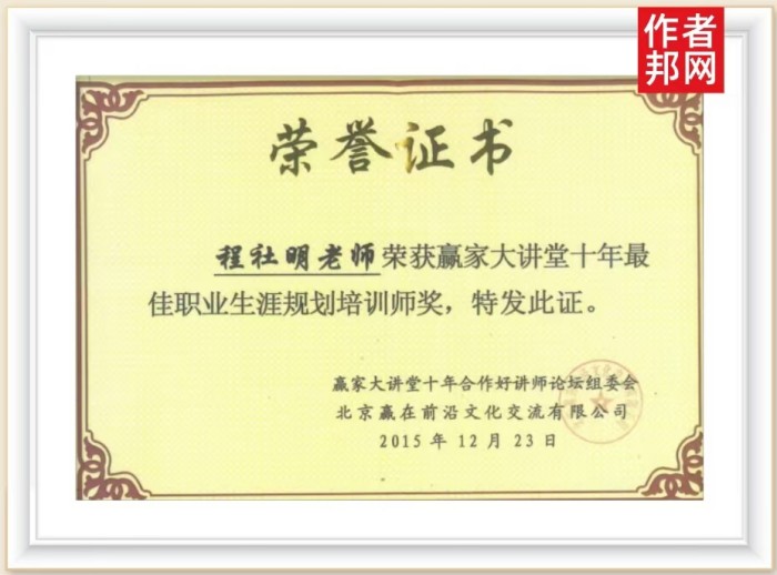 (程社明老师荣获“赢家大讲堂十年最佳职业生涯规划培训师奖”)