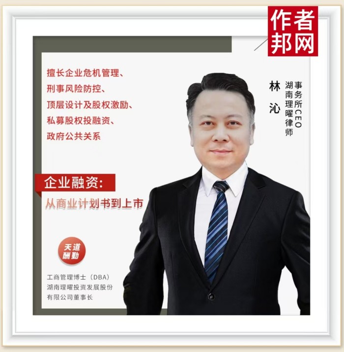 林沁是工商管理博士,湖南理曜投资发展股份有限公司董事长、湖南理曜律师事务所CEO,擅长企业危机管理、刑事风险防控、顶层设计及股权激励、私募股权投融资、政府公共关系等领域。