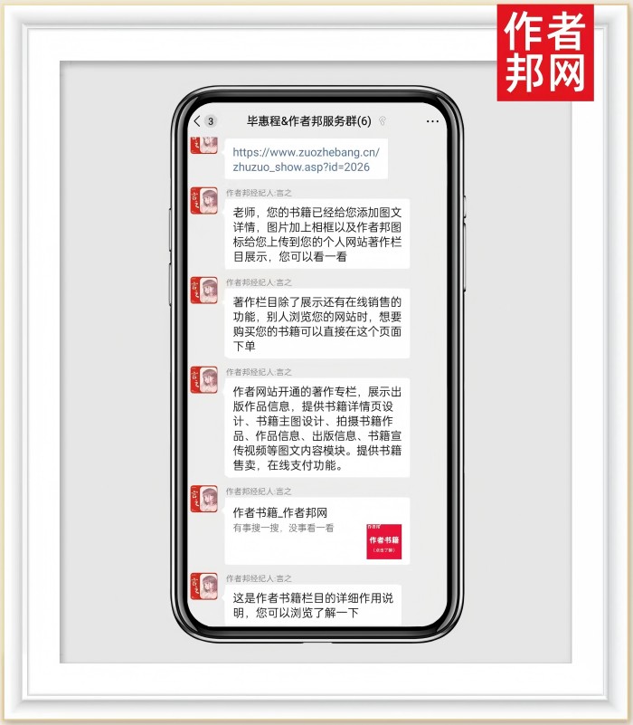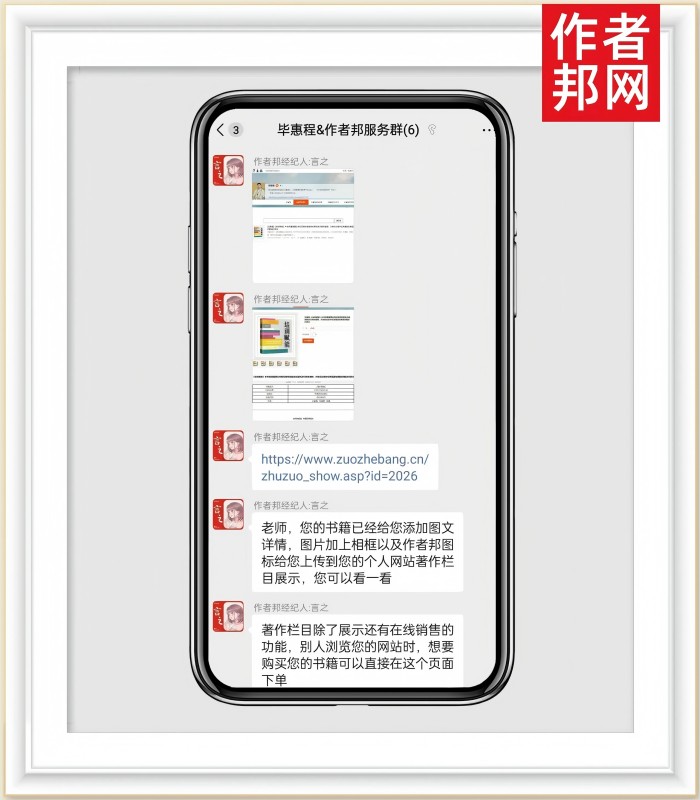 (到百度进入作者邦网,转发作者邦官网新闻中的“作者书籍栏目”介绍链接到群里)