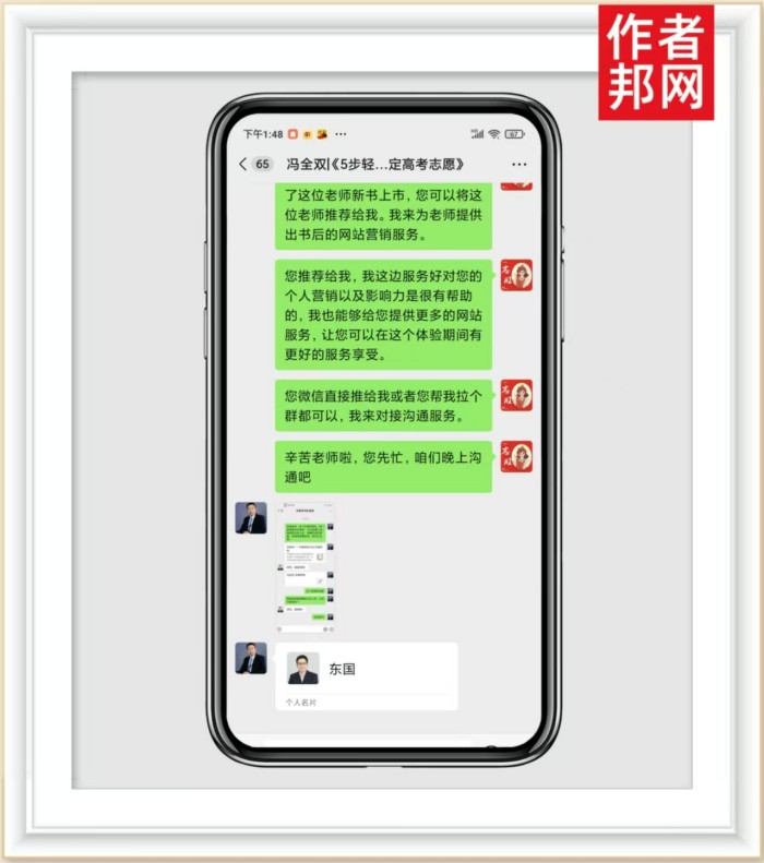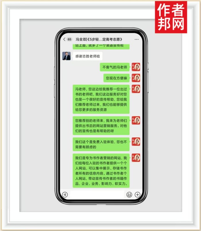 老师,我看您朋友圈分享过XX老师,他出版过书籍,您可以将这位老师推荐给我,由我们来提供网站营销服务,我们这边服务好对您也是一个很好的宣传帮助,您给我们推荐老师过来,我们也能够提供给您更多的服务资源