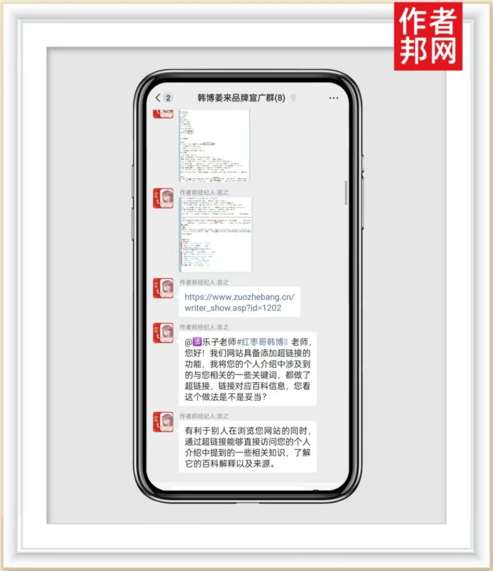 作者邦经纪人与作者沟通确认,个人介绍信息是否有更新或修改,保证作者个人介绍信息准确真实的公开展示,并添加百科超链接,有利于读者客户浏览作者网站时,能够通过超链接直接访问作者个人介绍中提到的企业、品牌等相关知识的百科解释。