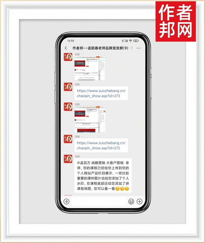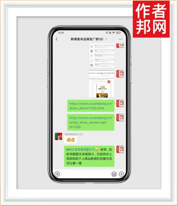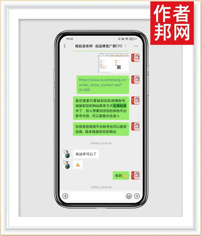 (到百度进入作者邦网,转发作者邦官网新闻中的“自品牌栏目”介绍链接到群里: https://zuozhebang.cn/alone_show.asp?id=71)
