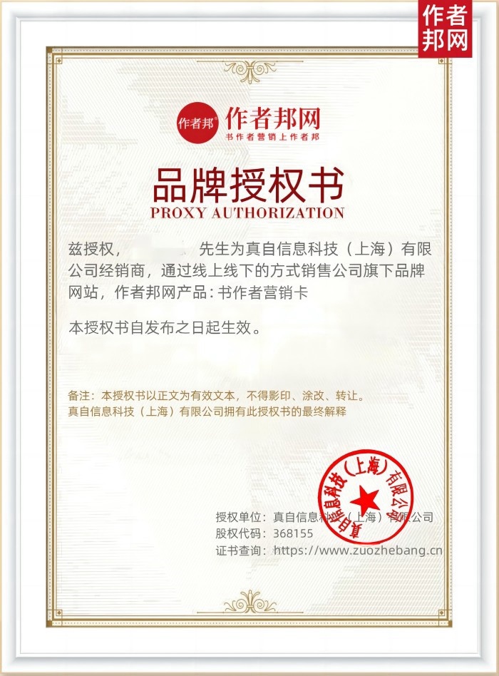 随着数字时代的到来,真自信息科技(上海)有限公司旗下品牌网站:作者邦网——这个专为书籍作者打造的综合性服务平台,于2025年正式开启了其全新的代理入驻模式,即“书作者营销卡”加盟代理及兼职市场。通过线上线下的全方位销售策略,推广其核心产品:书作者营销卡。以更加开放的姿态和创新的商业模式,共同开拓全国市场,为书作者和广大读者搭建一座更为紧密、高效的桥梁。