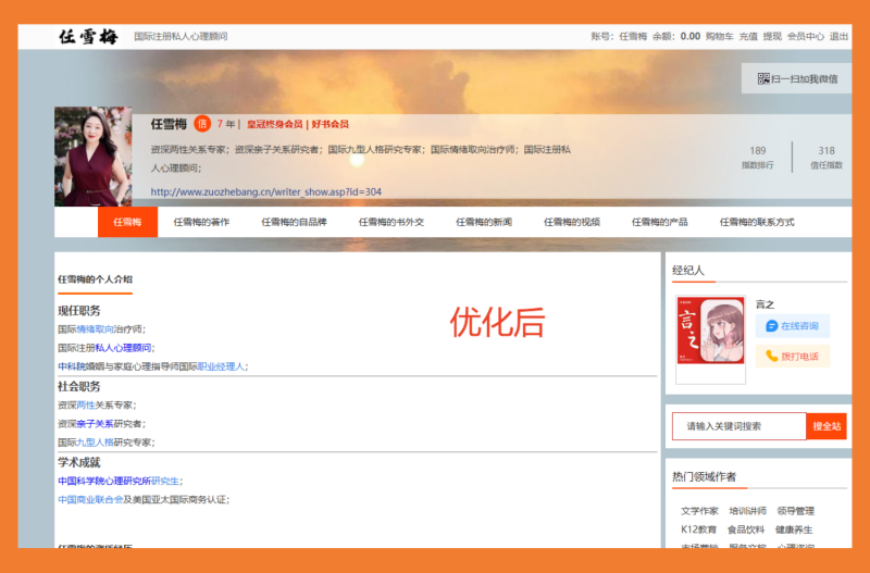 在信息洪流奔涌的时代,一位畅销书作者的个人品牌形象,恰似一座灯塔的光芒——清晰度决定影响力半径。当知名作家任雪梅老师与作者邦采编经纪人团队携手,一场关于个人专业形象的精妙蜕变悄然发生。优化前,她的成就如散落明珠;优化后,则被精心串联为一条璀璨夺目的项链,每一颗都熠熠生辉,让每一位踏入其“专业殿堂”的访客,都能在瞬间读懂“任雪梅是谁”。