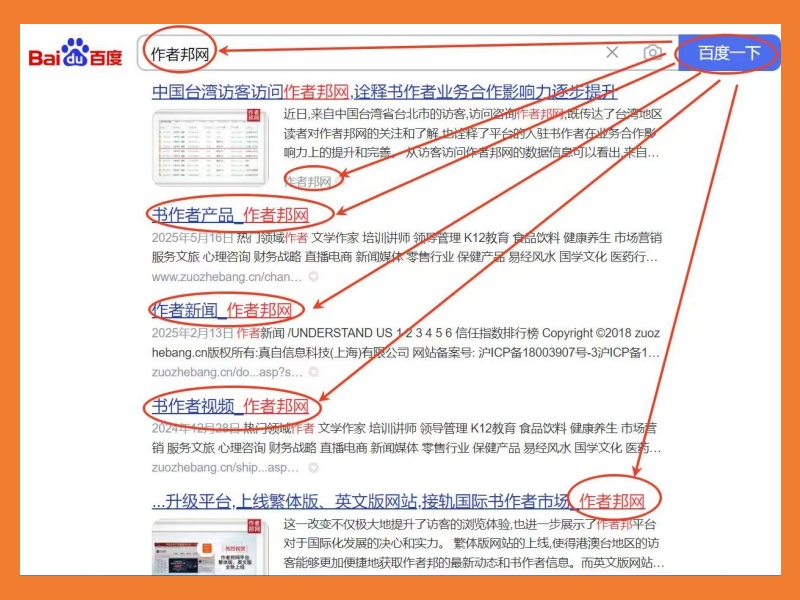 在互联网时代,搜索引擎是用户获取信息的第一入口。作者邦网通过系统化的SEO优化、内容矩阵布局及多渠道传播,成功实现百度搜索结果的全方位覆盖。无论是品牌介绍、服务案例、行业动态,还是用户评价,都能在搜索结果中清晰呈现。这种“霸屏效应”不仅提升了品牌曝光度,更增强了用户信任感——当潜在客户搜索“作者邦网”时,海量正面信息无疑会大大降低其决策成本,促使其更快选择作者邦的服务。