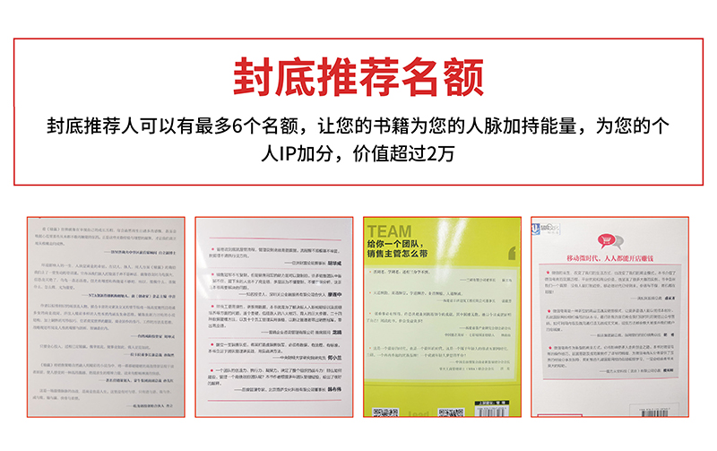 作为专业图书策划出版领域中的领跑者,出书大师网致力于从细节着手,依托于优势的基础资源和行业优势,打造别具一格的自品牌效应。封底推荐名额便是一种基于自品牌传播助力客户打造人脉链接关系的潜在收益。在出书大师网策划出版的作品中,我们可以很清楚的看到每一本书籍的封底都有各大明日的推荐语录,与作者的书籍之间互不连接,相当益彰。