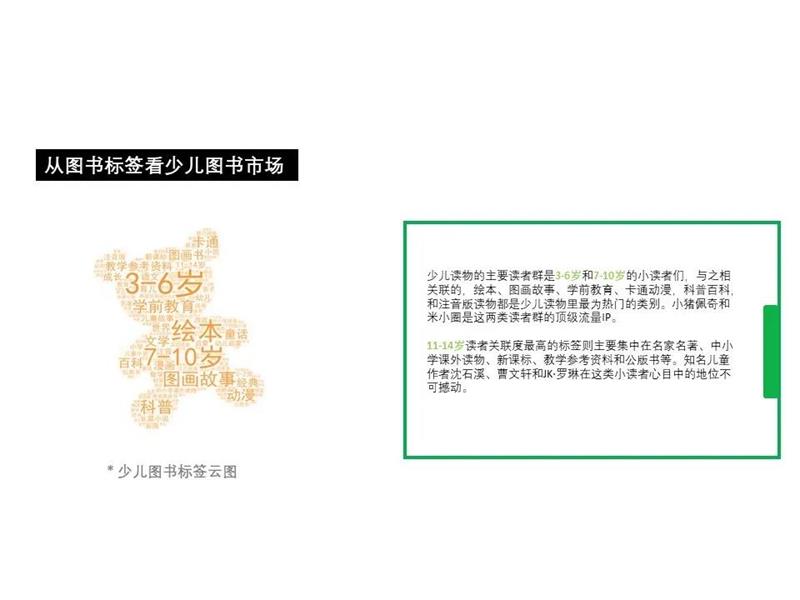 通过绘制少儿图书的总体标签云图,我们可以清楚看到,少儿读物的主要读者群是3-6岁和7-10岁的小读者们,与之相关联的,绘本、图画故事、学前教育、卡通动漫,科普百科,和注音版读物都是少儿读物里最为热门的类别。小猪佩奇和米小圈是这两类读者群的顶级流量IP。