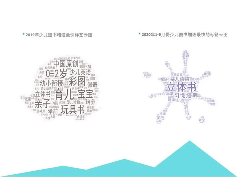 从2020年1-9月的标签云图来看,上半年受疫情影响全国各地早教机构迟迟无法正常运营,因此3月份以来,低幼读物类同比出现较大幅度的上涨。立体书、有声书、乐器书、纸板书、洞洞书等形式多种多样的早教类读物成为年轻夫妇们的哄娃神器。