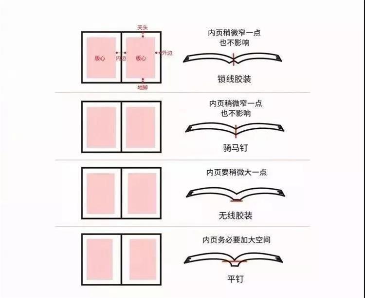 书本如何装钉一大张纸印上书页后经过折叠后,将它们集结在一起并装钉完即成为了一本书。装钉方式因展开角度和耐用程度也各有不同,内文页数也会影响装钉方式的选择。锁线胶装和平钉适合页数多的书,骑马钉则适合需要摊平页面的杂志等。装钉方式与内边的关系即使版心大小相同,只要装钉方式不同,内边大小就必须随之调整。例如骑马钉方式装钉时,页面可以摊平因此内边稍微窄一点也不影响。但是采用无线胶装或平钉等方式无法大幅展开,所以需要适当增加内边尺寸。