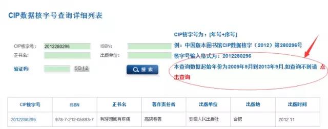 3、进入页面后,可按照网站提示和要求输入书籍版权页上的信息和网站验证码,下方表格即会显示图书信息;但网站有“本查询数据……请点击查询”字样,所以在该年限范围之外出版的书籍查询则需点击红字”点击查询“进入下一查询界面;