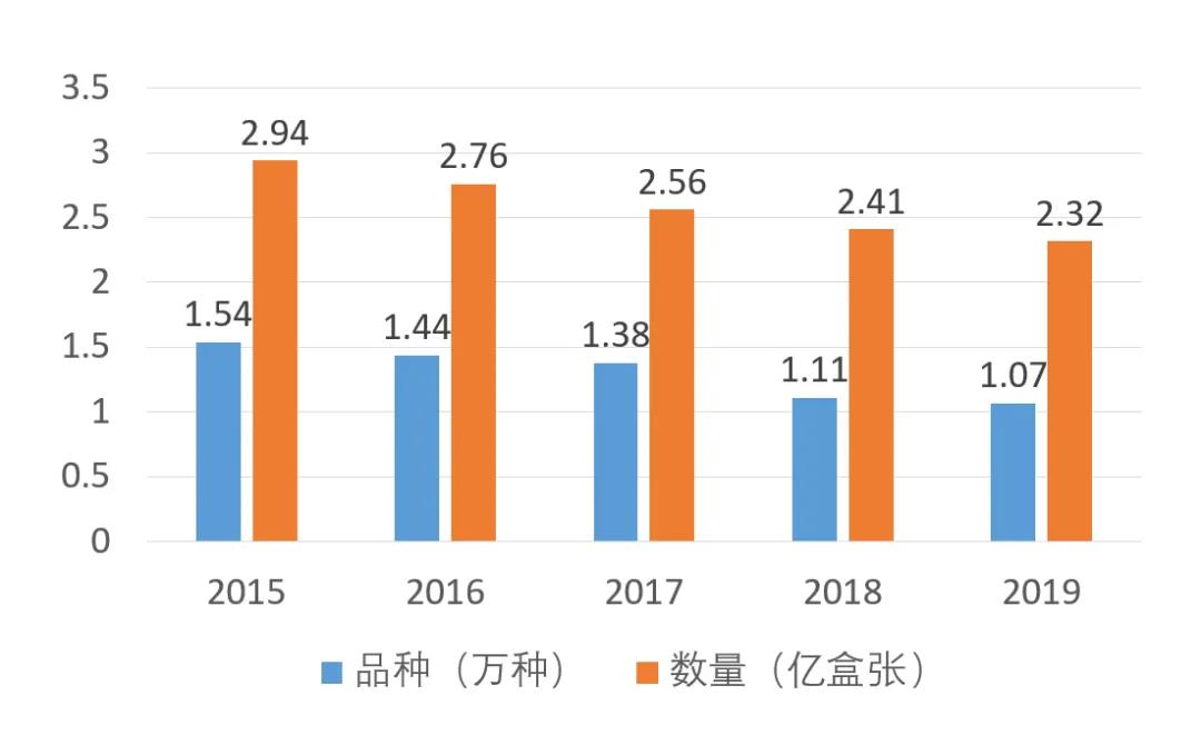 报纸出版曾为纸介质出版中的最大比重,相当一个时期中报纸出版的发展优于图书出版和期刊出版:当图书出版、期刊出版总印数数度出现徘徊、下降、回落时,报纸出版总印数始终处于递增状。直到“十二五”后期的2014年,报纸出版总印数骤然下降,且降势一直持续至“十三五”的2019年。其品种递减依次为:2016年同比下降0.63%,2017年同比下降0.53%,2018年同比下降0.69%,2019年同比下降1.07%;其总印数递减依次为:2016年同比下降9.31%,2017年同比下降7.07%,2018年同比下降6.96%,2019年同比下降14.16%。2019年报纸品种比“十二五”末下降2.89%,报纸总印数比“十二五”末下降26.16%,降幅大于期刊总印数的降幅。