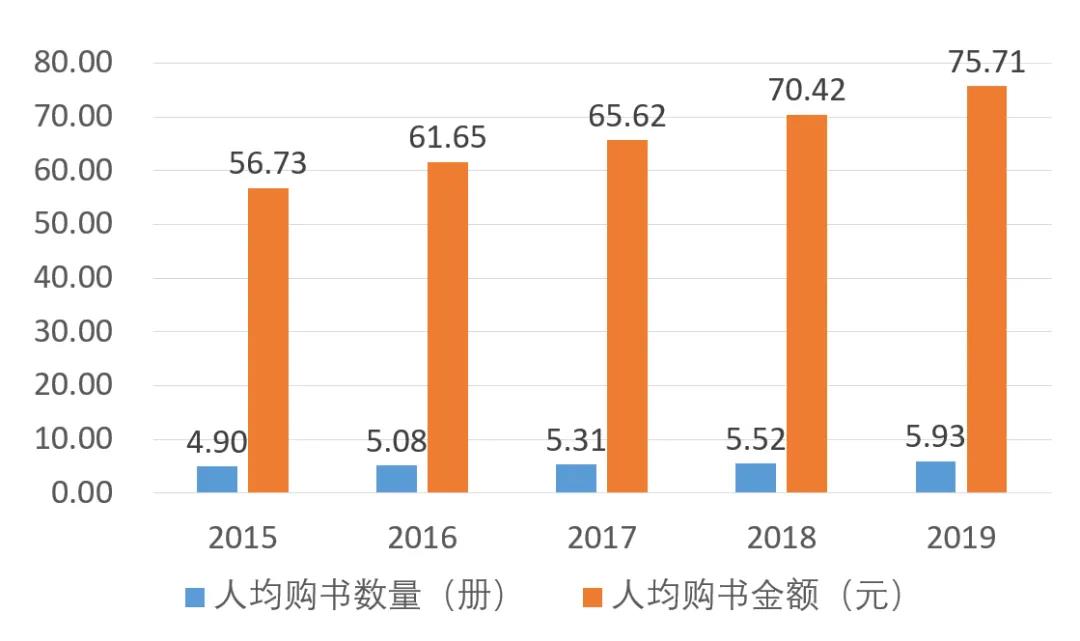 2019年出版物纯销售83.04亿册、1059.92亿元,不仅使纯销售数量和纯销售金额分别升阶80亿和1000亿,还分别创下新中国70年销售之“最”。这两项史上新高,与“十二五”末比较,销售数量增长23.39%,销售金额增长35.91%,这两项分别逾2成和逾3成的增长,使“十三五”时期出版物发行业的发展提速。“十二五”末以来出版物纯销售的递增及创史上新高,是出版业高质量发展的重要特征,同时也促成了“十二五”末以来全国人均购书的持续递增(见图13),改变了“十二五”时期乃至之前更长时期的人均购书下降、回落。其间的人均购书额把国民年人均图书消费提升至70元新阶,而2019年的人均购书5.93册,不仅创下20多年间的人均购书新高,还逼近史上6册的纪录。