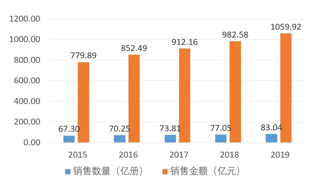 一是图书出版总印数的递增(见图5),增幅依次为2016年同比增长4.32%,2017年同比增长2.29%,2018年同比增长8.29%,2019年同比增长5.87%。图书总印数递增,是不含价格因素的出版实物量的递增,比一些隐含价格因素的指标增长更具难度。“十三五”时期的图书总印数递增的重要意义在于,不仅扭转了“十二五”期间乃至之前相当一个时期内图书总印数数度下降的状况,还把中国出版业的图书总印数提升至100亿册新阶。特别是2019年在图书出版总品种减少的情况下,图书总印数的递增是近四分之一世纪以来的首度出现,更加来之不易。