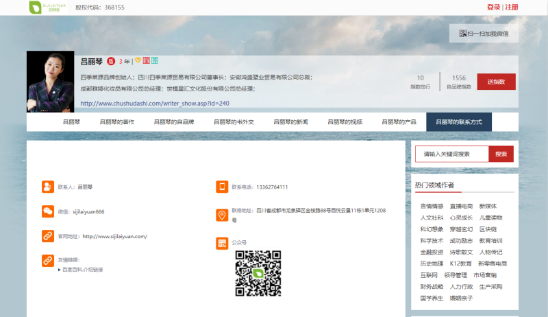 近日,吕丽琴女士受邀入驻诚信书作者平台,并且开通了联系方式,从而有效地提高了其全网的个人品牌影响力。