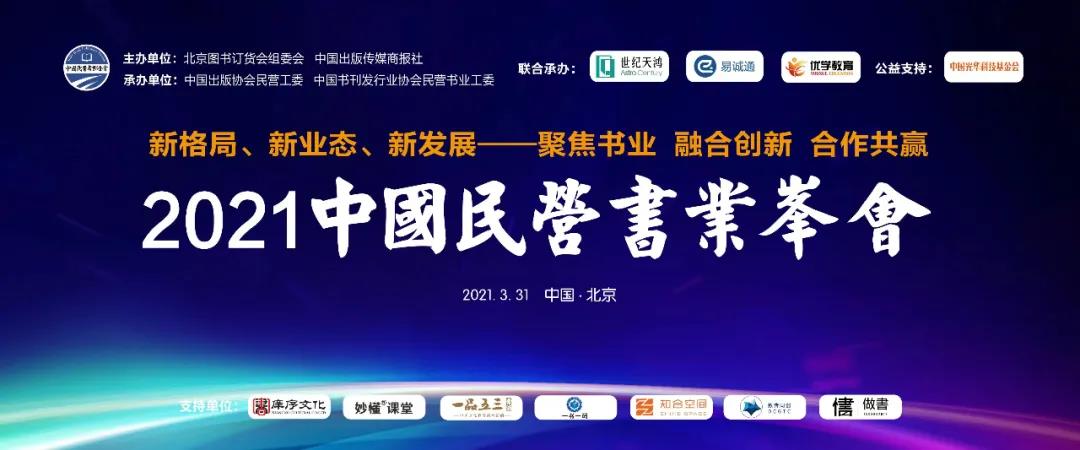 2021年3月31日,以“新格局、新业态、新发展——聚焦书业 融合创新 合作共赢”为主题的“2021中国民营书业峰会”在北京召开,今年是民营书业峰会的第11个年头。本届峰会由北京图书订货会组委会、中国出版传媒商报社主办,中国出版协会民营工委、中国书刊发行业协会民营书业工委承办,世纪天鸿教育科技股份有限公司、北京易诚通信息技术有限公司、北京优学教育科技股份有限公司联合承办,中国光华科技基金会公益支持。