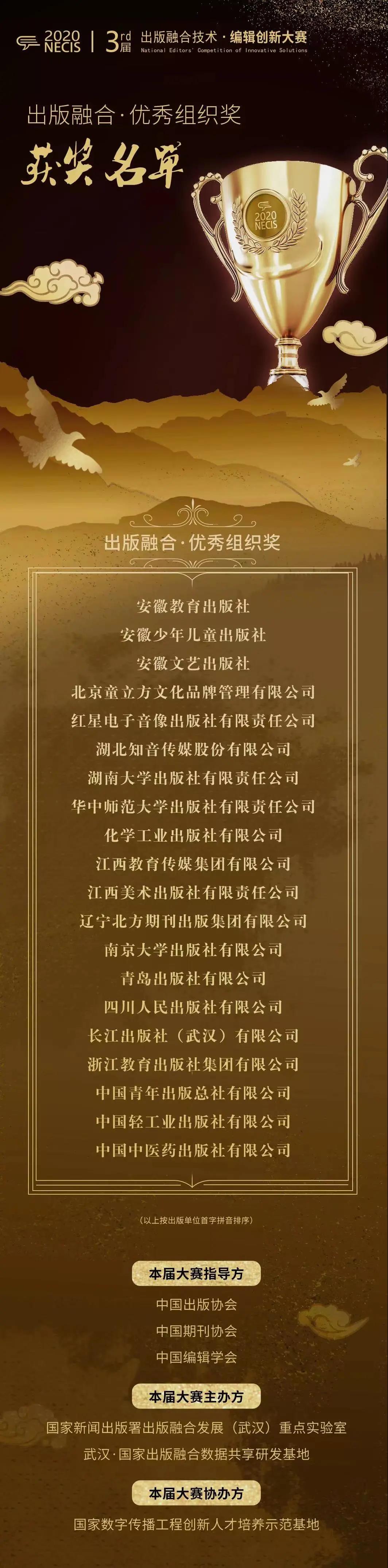 近日,中国出版协会、中国期刊协会、中国编辑学会指导,国家新闻出版署出版融合发展(武汉)重点实验室、武汉·国家出版融合数据共享研发基地主办的第三届出版融合技术·编辑创新大赛完成了四个赛季比拼,正式收官并公布获奖名单。