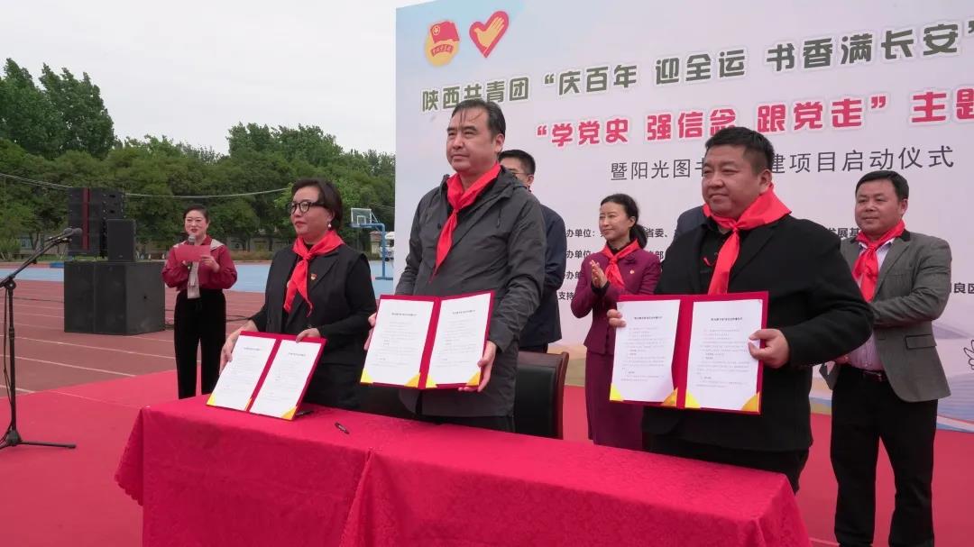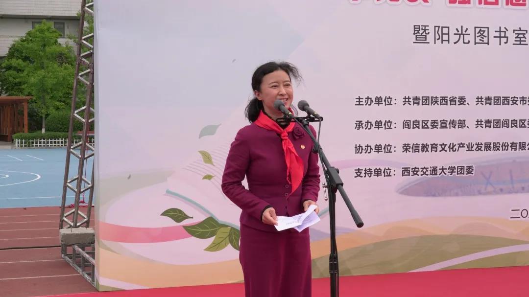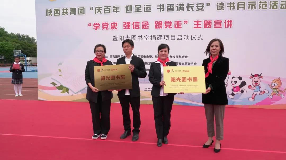 芳菲四月,正是读书好时节。在第26个“世界读书日”即将到来之际,4月19日下午,陕西共青团“庆百年 迎全运 书香满长安”读书月示范活动“学党史、强信念、跟党走”主题宣讲暨“阳光图书室”捐建项目启动仪式在阎良区西飞第一小学举行。