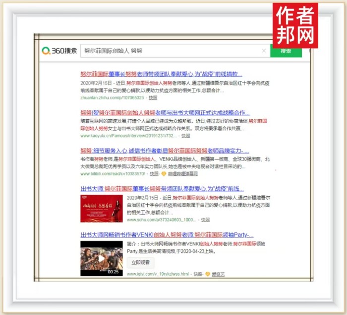 近日,努尔菲国际创始人努努书作者关键词霸屏360、搜狗、百度三大平台,社会影响力显著提升。这不仅是一种品牌价值的提升方式,更是一种全面展示品牌自身魅力的有效形式。努努书作者关键词登陆360、搜狗、百度供网友检索,能够为其带来丰厚的流量,大大提高个人品牌在广大网友心中的信任度和了解度,从而产生更多的业务流程转换率,提升企业知名度,增强企业形象。