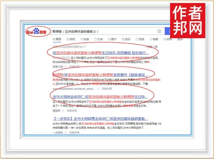 经前期传播与积累,亚洲自媒体超明星教父韩德智书作者营销网站被360、搜狗、百度平台收录,只需要在平台搜索引擎输入“韩德智”相关关键词,便能获取系统详尽的品牌内容。这种方式既便捷又有效,能够确保大众快速搜索到韩德智老师及其个人品牌相关内容,全方位了解其个人品牌魅力,提升韩德智老师大众知名度。