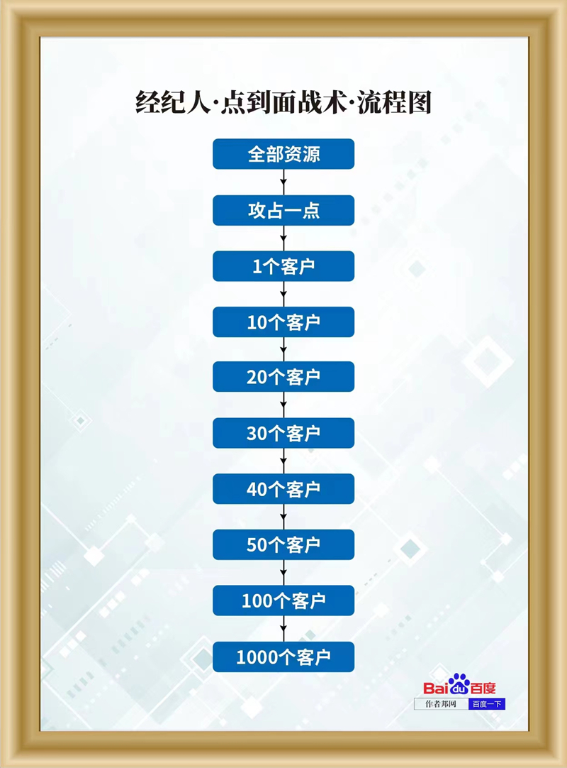 这个以点带面的过程中,经纪人始终围绕自身全部资源实力去服务客户的原则不变,并在1个客户的基础上发展为10个客户,然后再从10个客户,发展为20、30、40、50、100甚至1000等更多量上的优质服务。此时,质量、资源和实力不变,客户数量上得到有序地提升,发挥出了经纪人以点带面战术的流程效率。既保证了书作者客户的品牌运营价值,也确保了客户服务的量上的提升。