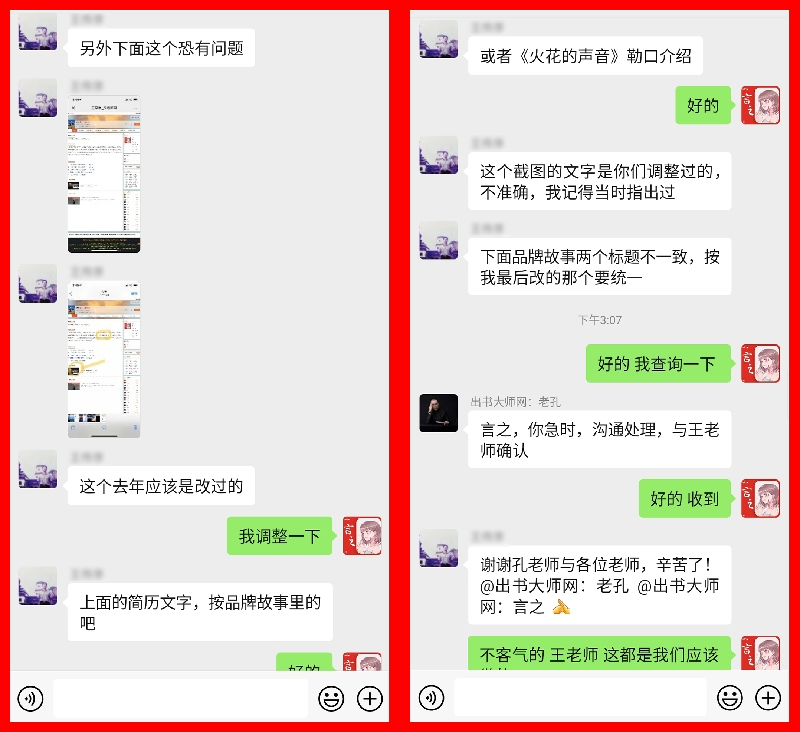 最近,作者邦网就与一位书作者客户进行了仔细的信息服务沟通交流。双方针对客户品牌页面上的图片信息调整更换、客户经历信息内容的修正、品牌故事内容表达细节的完善等,进行了细致而周全的交流与探讨。并且,作者邦网团队还就书作者客户的宝贵意见认真对待,并立即采取行动细心、细致而又准确地将相关信息进行了修改和调整。从而,收获了客户的满意表态。