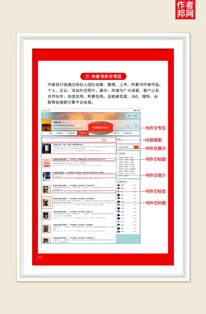 书作者的一个个人履历展示栏目,且展示于整个互联网,公开透明,是书作者个人信用信息展示。彰显作者自身的个人品牌实力与行业影响力,且能被百度、360、搜狗、谷歌等各搜索引擎平台收录。
