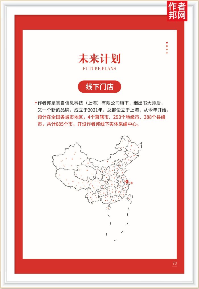 ·作者邦是真自信息科技(上海)有限公司旗下,继出书大师后,又一个新的品牌,成立于2021年,总部设立于上海,从今年开始,预计在全国各城市地区,4个直辖市、293个地级市、388个县级市,共计685个市,开设作者邦线下实体采编中心。