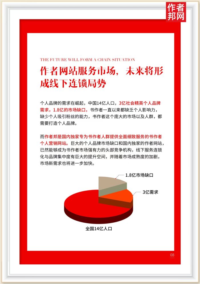 而作者邦是国内独家专为书作者人群提供全面细致服务的书作者个人营销网站。巨大的个人品牌市场缺口和国内独家的作者网站,已然能够成为书作者市场强有力的头部竞争机构,线下服务连锁化与品牌集中度有巨大的提升空间,并随着市场成熟度的加剧,市场新需求也将进一步加快。 1.8亿市场缺口 3亿需求 全国14亿人口
