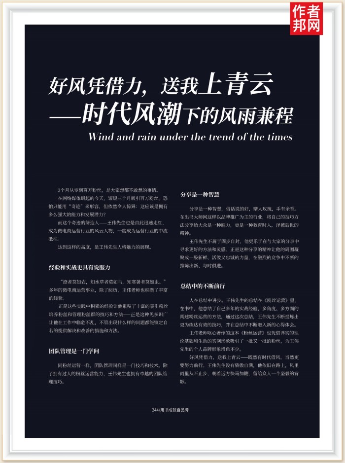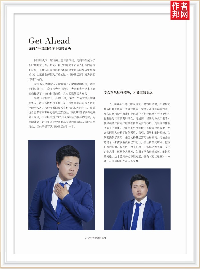 集才华与名誉于一身的王伟,这样一个名誉加身的魅力男人,没有人能想到王伟还是一位极具电商运营天赋的全能型人才,现任安徽网睿教育科技总经理的王伟,凭借这自己多年来积累的电商运营经验,不仅具有5年多微电商创业经验,而且还创造了3个月从零到百万粉丝的奇迹。为回馈社会,带领更多热爱且兼具天赋的运营达人玩转电商行业,王伟于是写就《粉丝运营》一书。