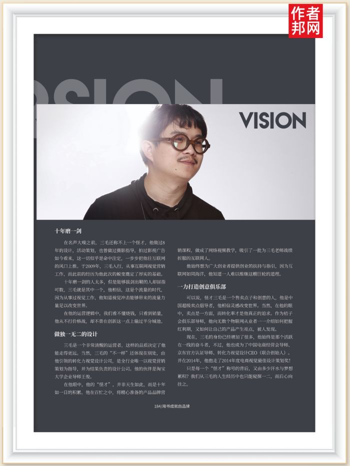 三毛是一个非常清醒的运营者,这样的品质决定了他能走得更远。当然,三毛的“不一样”还体现在别处,由他引领的转化力视觉设计公司,是全行业唯一以视觉营销策划为指导,并为结果负责的设计公司。他的伙伴是淘宝大学企业导师王俊。