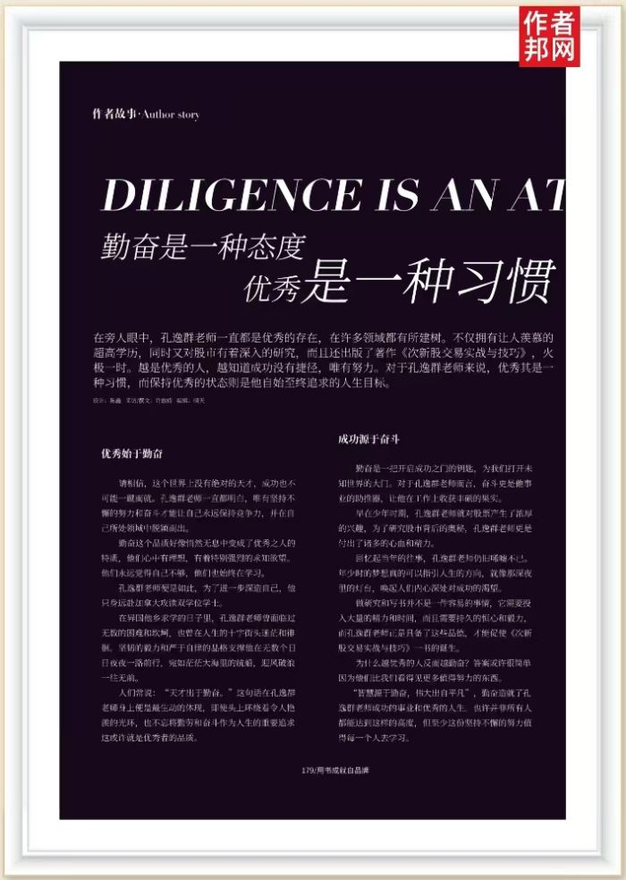 在旁人眼中,孔逸群老师一直都是优秀的存在,在许多领域都有所建树。不仅拥有让人羡慕的超高学历,同时又对股市有着深入的研究,而且还出版了著作《次新股交易实战与技巧》,火极一时。越是优秀的人,越知道成功没有捷径,唯有努力。对于孔逸群老师来说,优秀其是一种习惯,而保持优秀的状态则是他自始至终追求的人生目标。