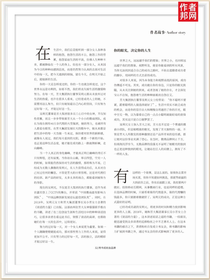 芳大集团的成功就是一步波澜壮阔的创业历史,其中的种种值得被所有人铭记,吴利元董事和芳大集团董事长吴小芳女士所合著的《谈话的力量》就是其中的佼佼者。这部讲述人与人之间的交流之道的书籍,是二位芳大女神根据自己多年的创业经历和生活经验而精炼而成,也从侧面反映了芳大集团为何能如此成功。