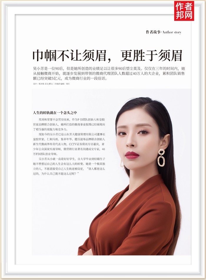 现如今的吴小芳已是山东芳大健康管理有限公司董事长皇胶世家、仁和闪亮、集草年华、健百滋等品牌联合创始人新生代微商界传奇代表人物,CCTV证券资讯专访嘉宾,青少年公众演说实战导师,微营销行业著名沟通成交专家,40万FD团队创业导师。