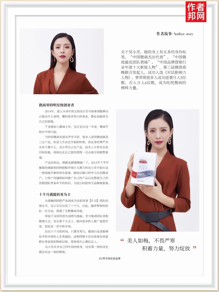 关于吴小芳,她的身上有太多的身份标签,“中国微商杰出代表”、“中国微商最佳团队领袖”、“中国品牌营销行业年度十大新锐人物”,第三届微商春晚联合发起人,成功入选《对话影响力人物》,曾带领很多人成功逆袭月入5位数,百人月入6位数,成为叱咤微商的榜样力量。