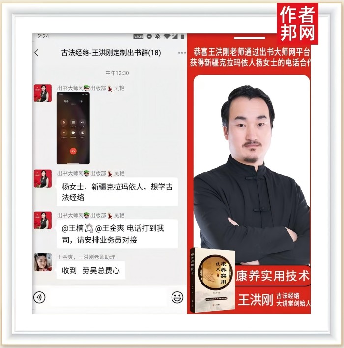 近日,来自新疆克拉玛依的杨女士便通过浏览出书大师网的诚信书作者平台,联系到出后服务的工作人员,对方明确表示,希冀通过出书大师网这个媒介平台认识北京经道堂国际中医药研究院院长王洪波老师,并希冀能够与之取得联系,向其请教关于古法经络方面的学术知识,听闻其诉求之后,出书大师网工作人员耐心解答,表示会帮助其联系,该客户留下电话号码欣然离去。