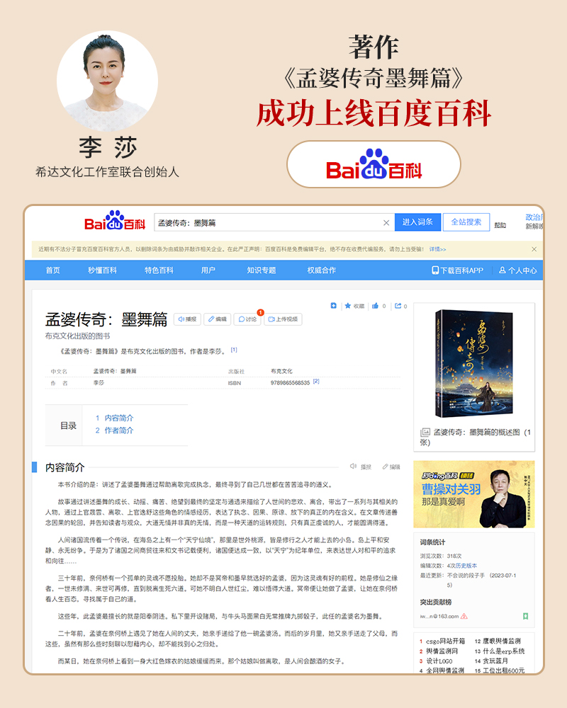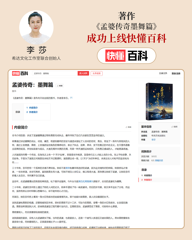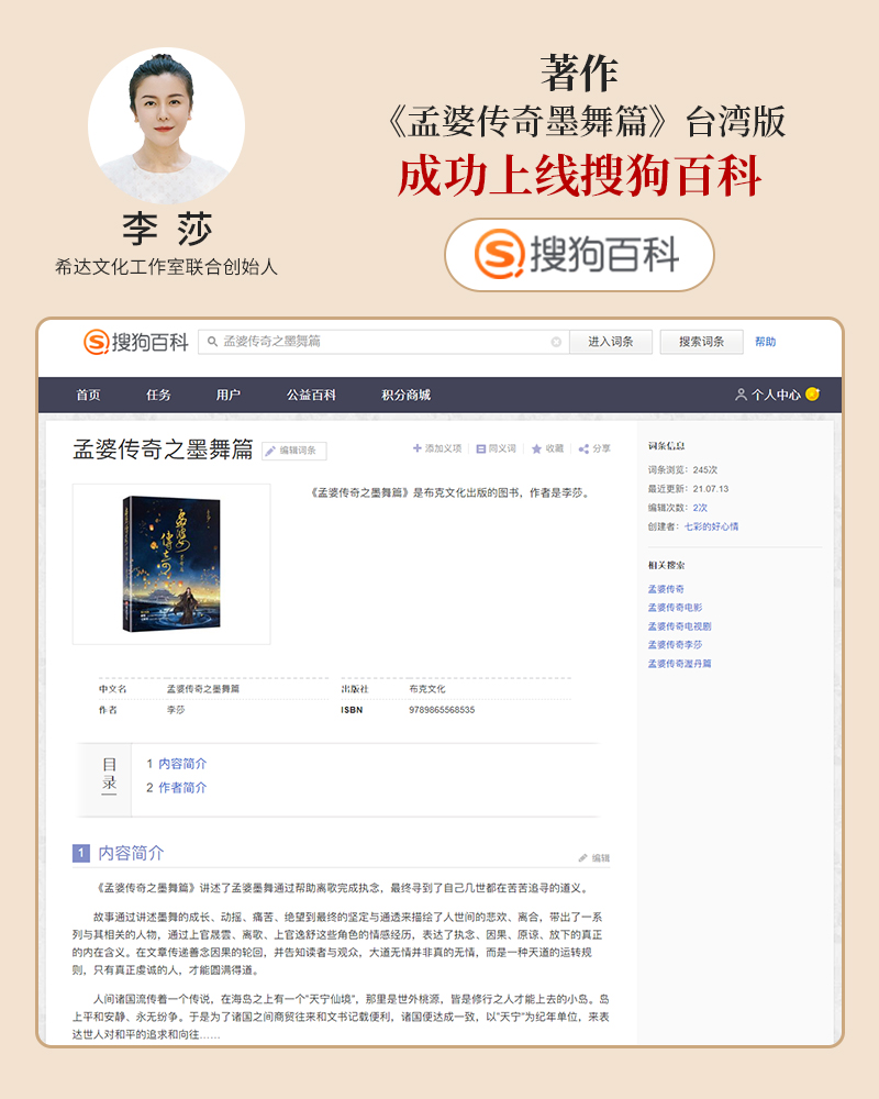 李莎:《孟婆传奇之墨舞篇》台湾版,成功上线百度百科平台