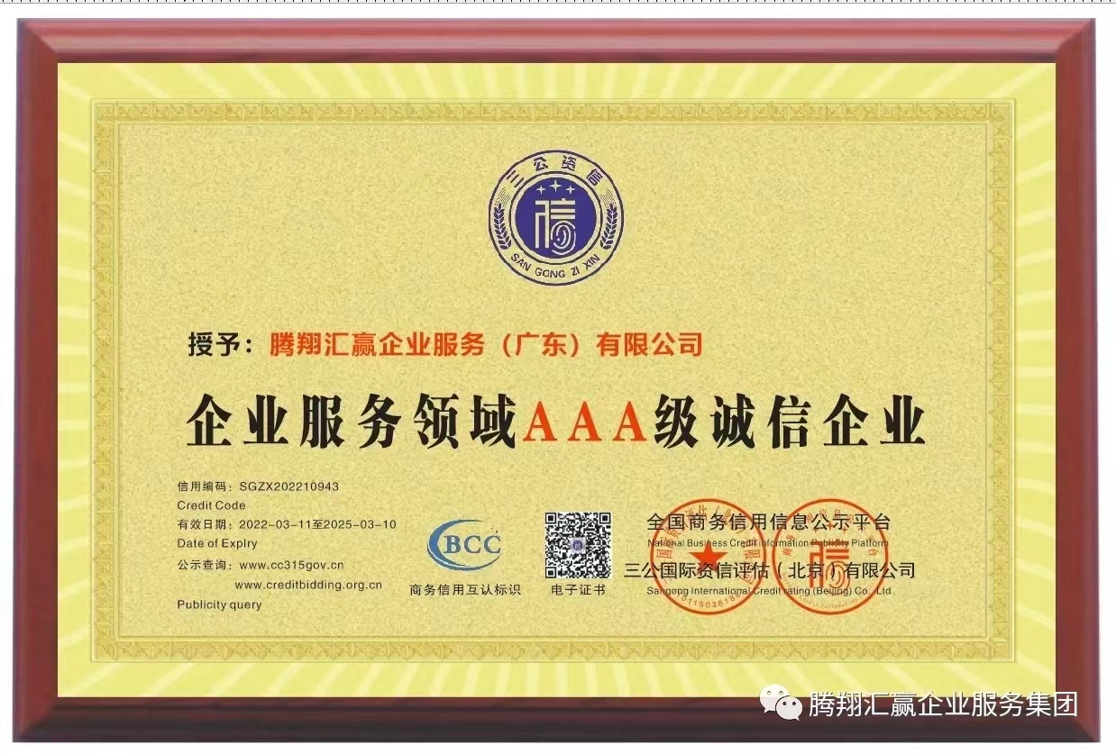 管鹏:三公国际资信评估(北京)有限公司授予腾翔汇赢企业服务(广东)有限公司全国商务诚信AAA共建单位
