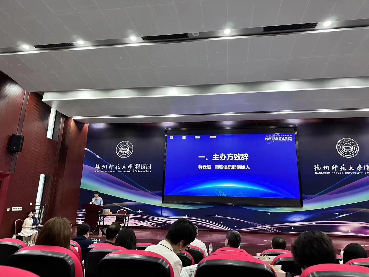 管鹏:《第二届杭州创业者高峰论坛暨南客俱乐部二周年大会》上,主办方蒋云超老师致词