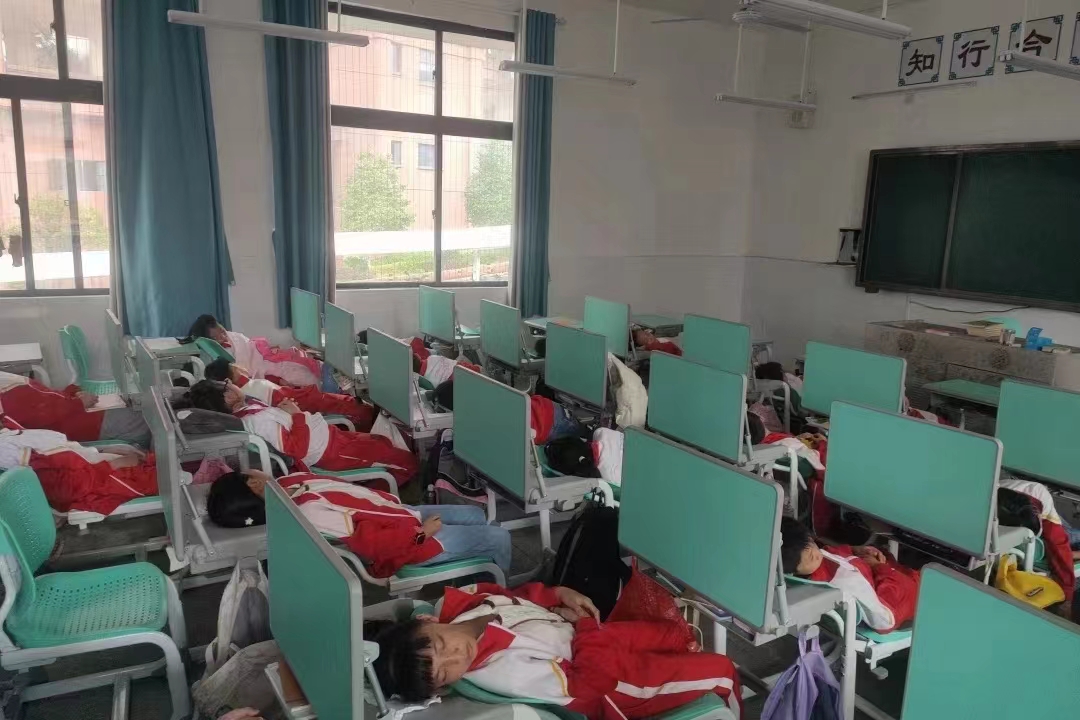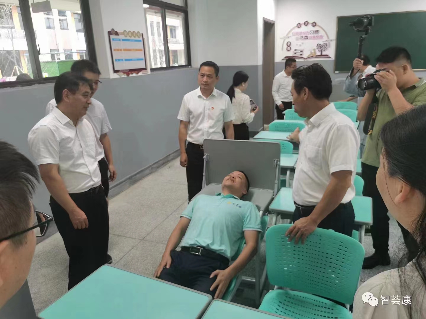 徐奕发:徐奕发老师和团队一起参观学生使用智荟康智能课桌椅熟睡的照片