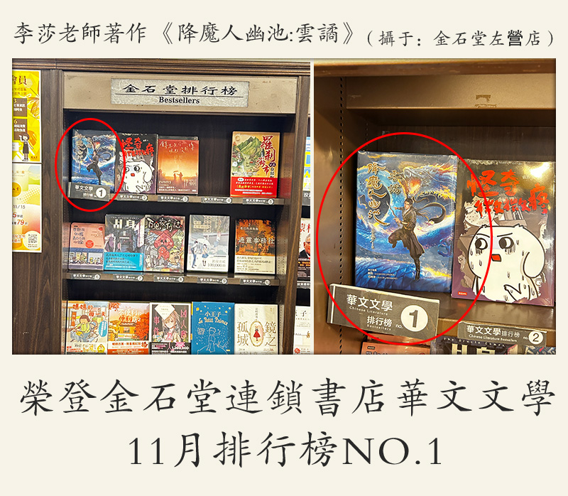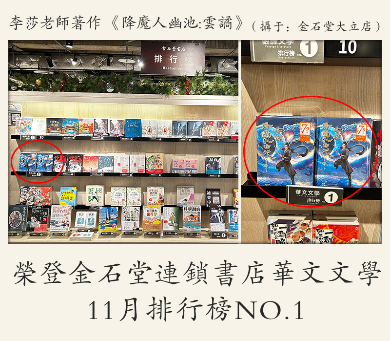 李莎:著作 《降魔人幽池:云谲》荣登金石堂连锁书店华文文学 11月排行榜NO.1 (摄于:金石堂 左營店)