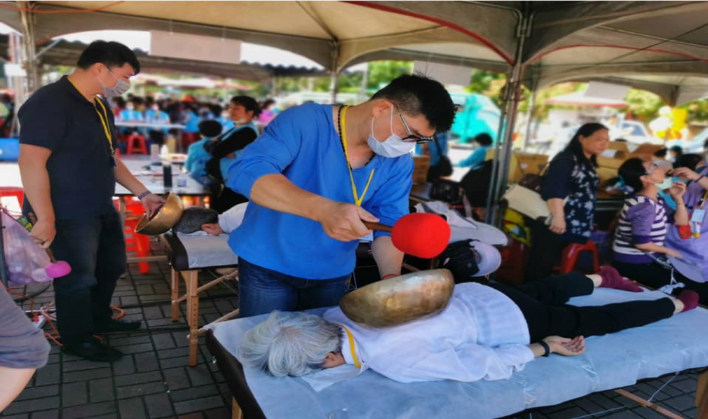杨裕仲:杨裕仲老师现场给需要疗愈的民众体验【钵·声灸】,体验过后都说紧绷的身体舒展开看很舒适