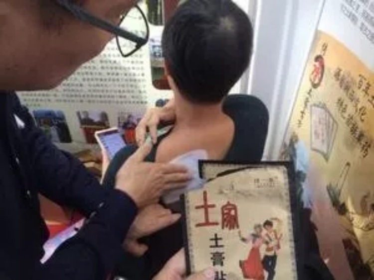 张杰: 患者肩部疼痛现场体验谭一春土家土膏药,并给予反馈贴着很舒服
