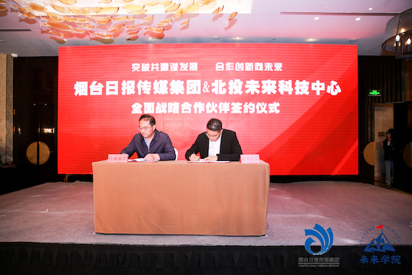 张伦:烟台日报传媒集团党委书记社长陈海涛与北京北投未来科技中心董事长张伦,上台签约