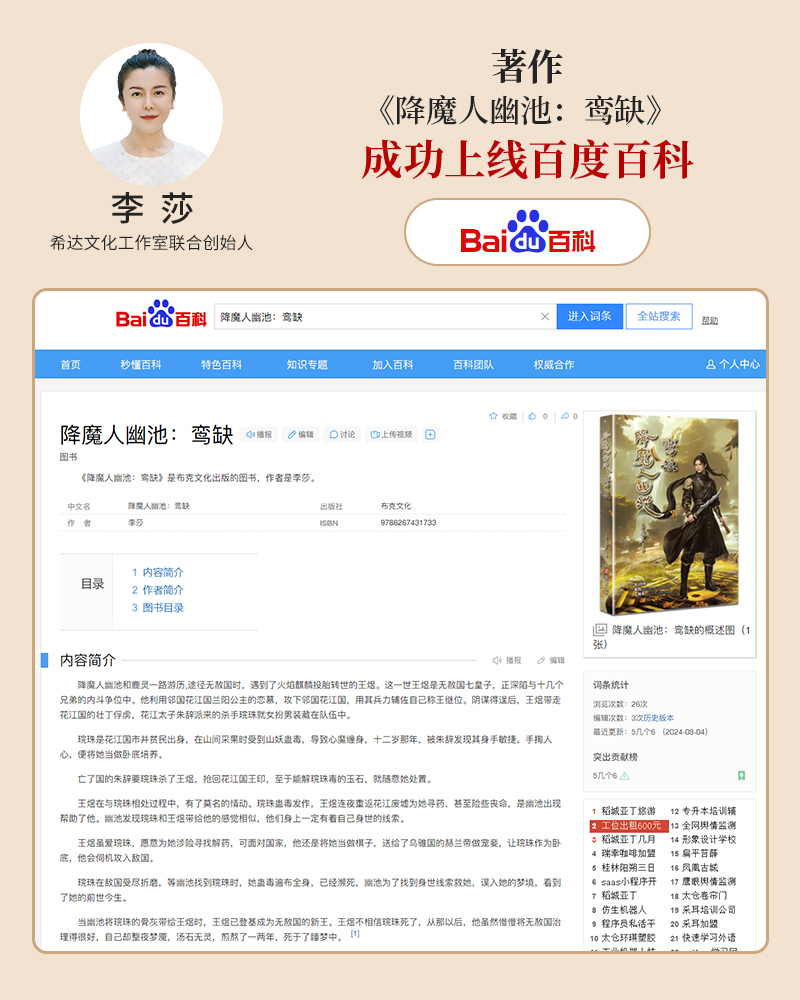李莎:《降魔人幽池:鸾缺》成功上架百度百科