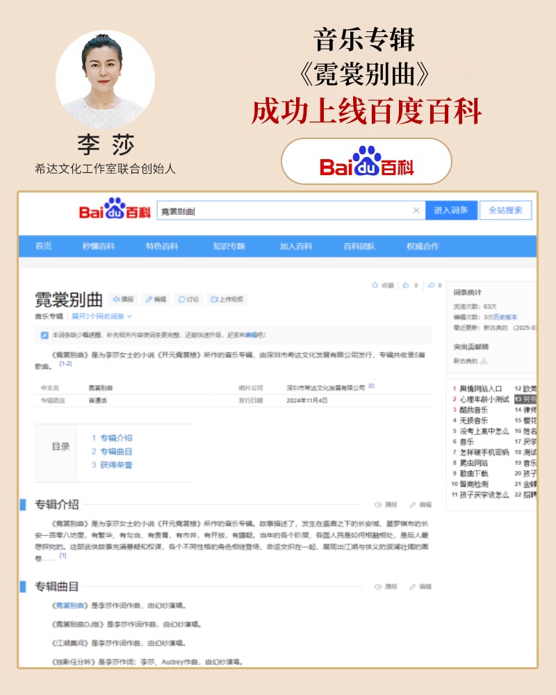 李莎:音乐专辑《霓裳别曲》,成功上线百度百科
