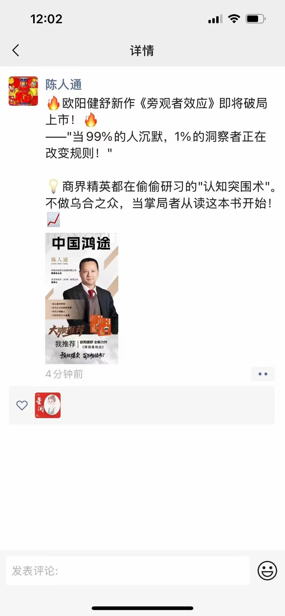 欧阳健舒:新书推荐官:陈人通朋友圈支持